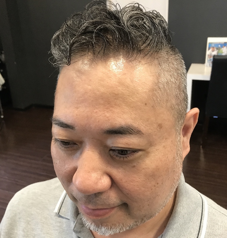 フェードカットにトップをパーマ。ジェルで仕上げてかっこいいお父さん!